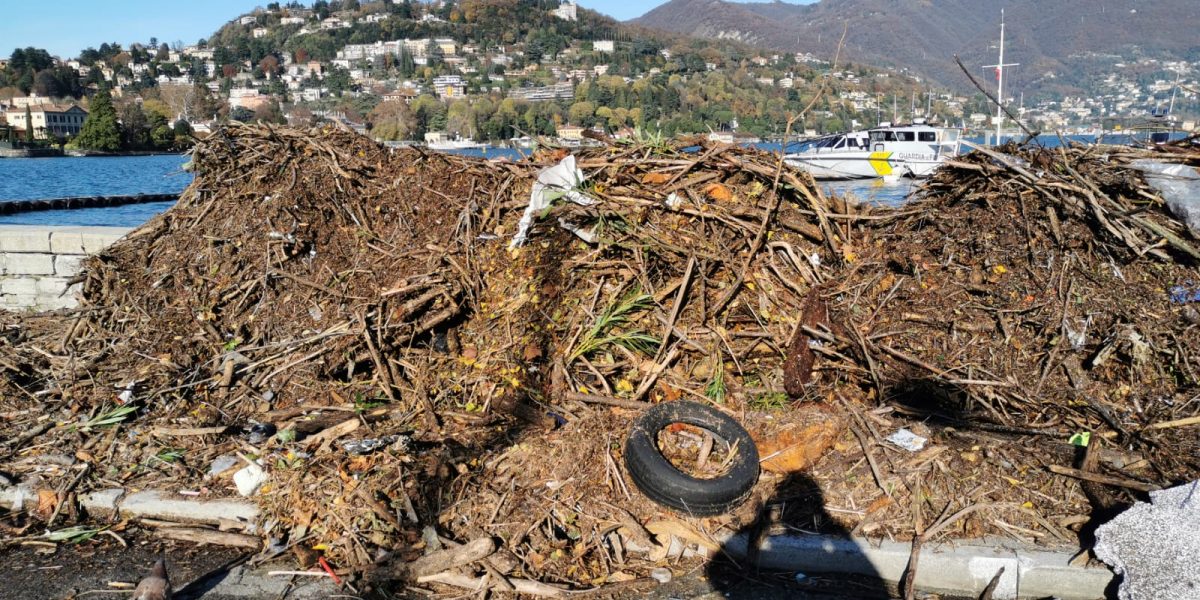 Una vera e propria montagna di detriti e rifiuti trascinati dalle acque del lago in questi giorni di maltempo sono arrivati sulle rive. E questa mattina, dopo le operazioni di pulizia, quello che si poteva osservare fuori dall’hangar di Como in fondo a viale Puecher appariva proprio come una vera collinetta composta da rami, erbacce e rifiuti di vario genere.